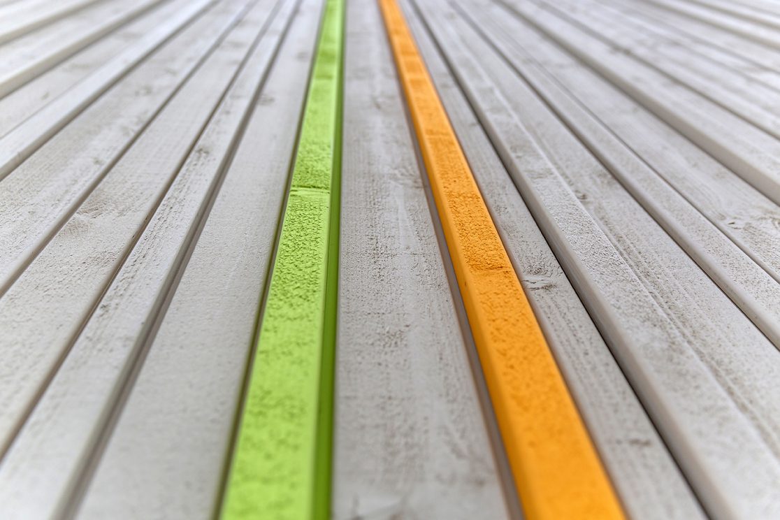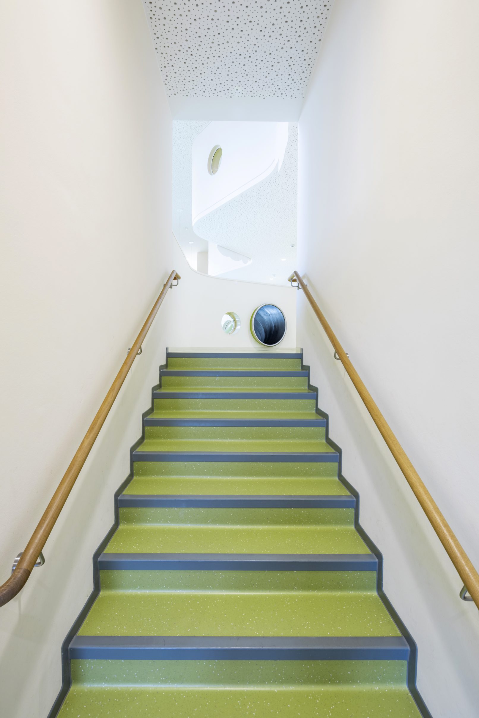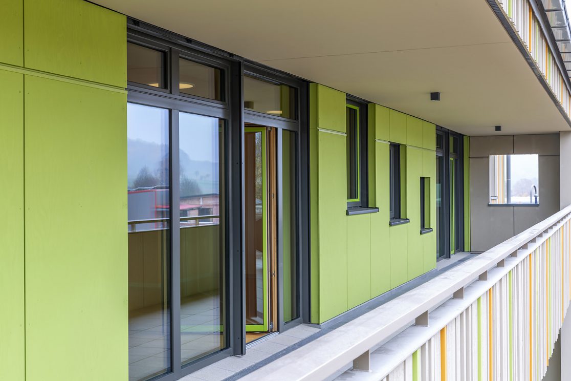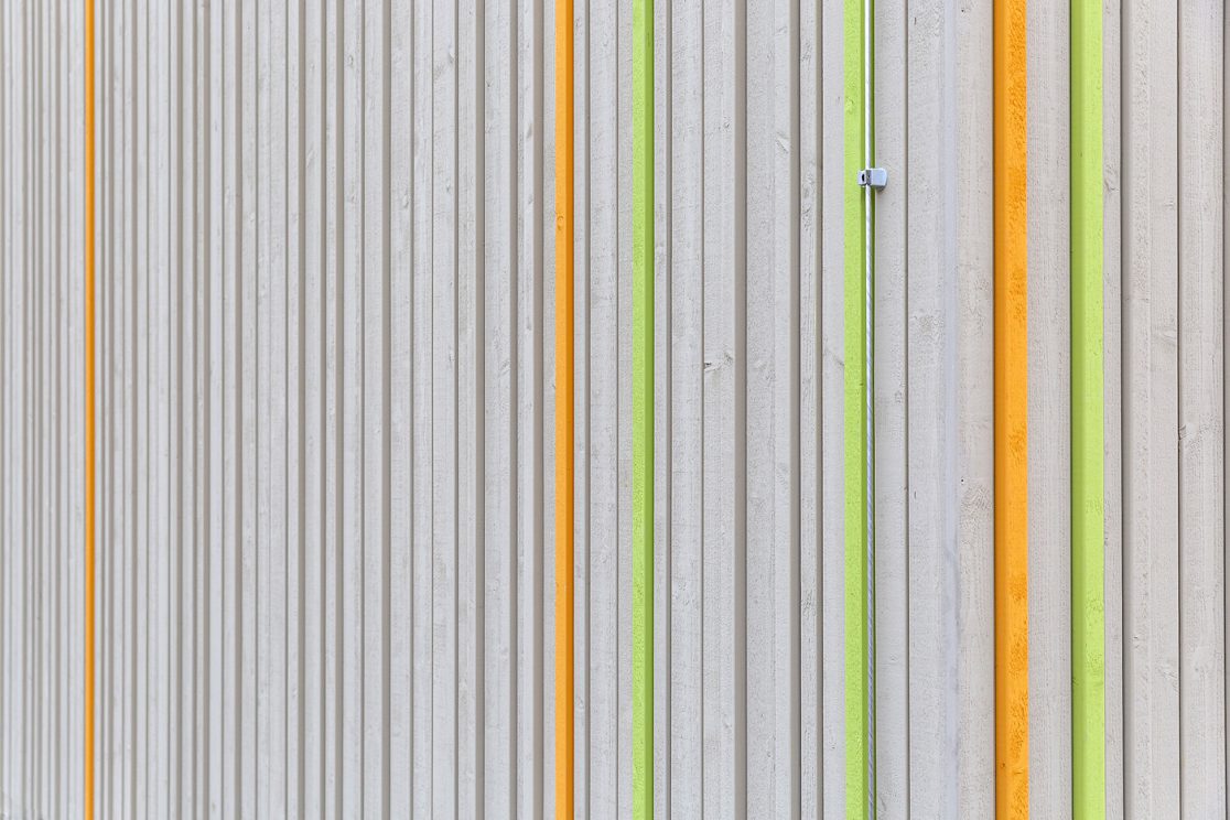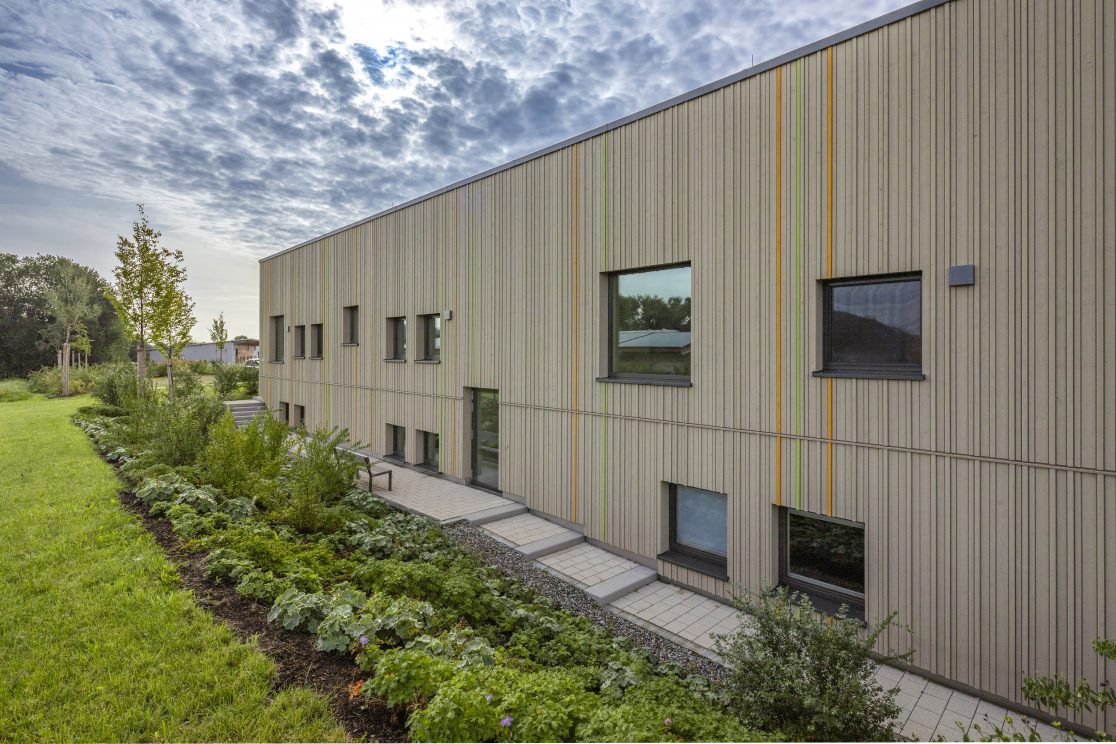 - Räumlich an der Nahtstelle eines Gewerbe-/ und eines Wohngebietes gelegen, von Westen über die „Gewerbeseite“ erschlossen, inhaltlich aber der Wohnnutzung zugehörig, reagiert das neue Gebäude mit einer klaren Großform selbstbewusst auf diese herausgehobene Lage. Mit insgesamt drei barrierefrei und behindertengerecht verbundenen, EG-Höhen ist das Bauwerk aus der vorhandenen Topographie entwickelt. Zentrales Entwurfselement ist der als „Mehrzweckraum ohne Dach” gedachte Innenhof der eine einfache, übersichtliche Grundrissdisposition mit einer klaren Zonierung der Funktionen ermöglicht. Fassaden sind – mit ihren auf den ersten Blick fast zufällig wirkenden, eingestreuten Öffnungen – aus den differenzierten Anforderungen der Innenräume entwickelt und mit einer vertikalen Holzlattung in einer zurückhaltenden Grundfarbigkeit mit vorsichtig eingesetzten Farbakzenten gegliedert.